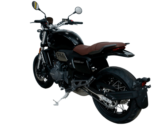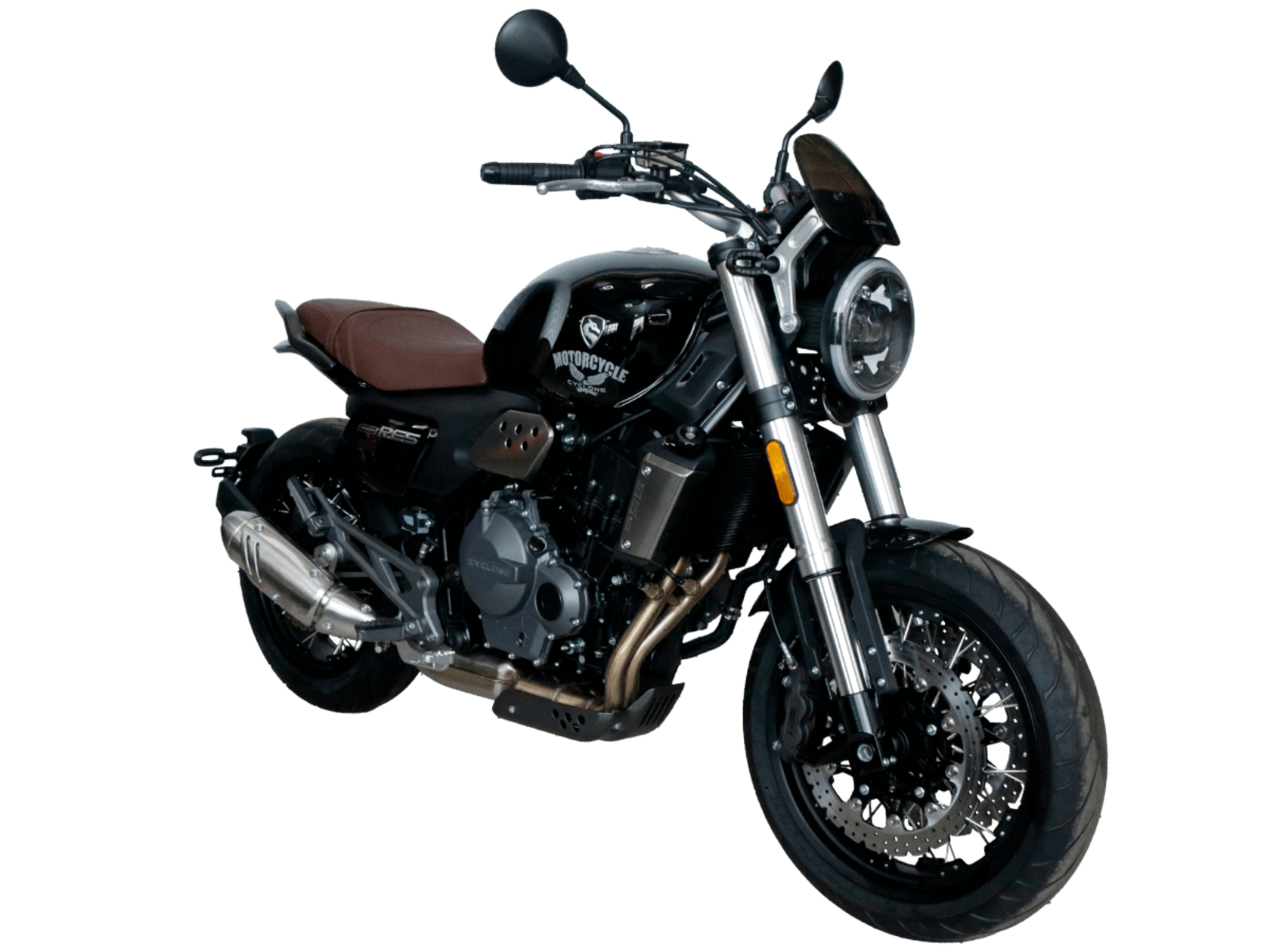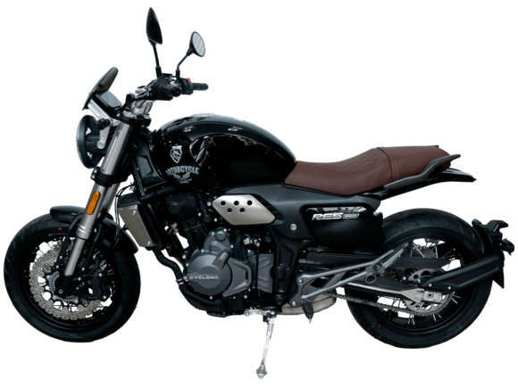 CYCLONE RE5 (SR600) – классик, в котором брутальная простота объединяется с современными технологиями. Данная модель является самой крупнокубатурной среди классических мотоциклов компании CYCLONE.Двухцилиндровый четырёхтактный двигатель объёмом 550 см3 выдаёт 60 л.с. на 8500 об/мин. Максимальный крутящий момент достигается на 6500 об/мин и составляет 55 Н·м. Инжекторный впрыск топлива с блоком управления BOSCH увеличивает топливную экономичность, а также позволяет добиться высокой приёмистости и неприхотливости агрегата. Жидкостная система охлаждения не допустит перегрева двигателя даже при самом агрессивном вождении. На мотоцикл установлена 6-ступенчатая механическая коробка передач.Максимальная скорость мотоцикла составляет 170 км/ч.RE5 оснащён классическими спицевыми колёсами диаметром 17 дюймов. Колёса обуты в бескамерные покрышки от легендарной фирмы PIRELLI. С неровностями дороги эффективно справляются телескопическая вилка перевёрнутого типа спереди и маятник с моноамортизатором сзади. Ход передней подвески составляет 120 мм, задней – 50 мм. Оба компонента подвески являются регулируемыми. Эффективное и безопасное замедление с любых скоростей обеспечивают гидравлические дисковые тормоза с ABS спереди и сзади. Тормозные системы произведены известной испанской фирмой J.JUAN (входящей в легендарный холдинг BREMBO).Клиренс мотоцикла составляет 155 мм. Объём топливного бака – 20 л. Снаряжённая масса – 204 кг.Из дополнительного оборудования можно выделить USB-порт и датчики давления в шинах.Мотоцикл сочетает в себе отличные технические характеристики, комфорт и надёжность, что позволяет вам ощутить настоящую свободу на любой дороге.