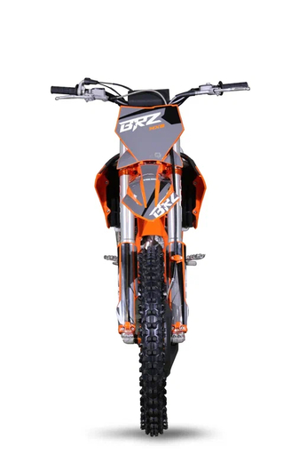 Полноразмерный кроссовый мотоцикл BRZ MX8 NX250 24 с двигателем NX250 ZS178MM-2 на карбюраторе FCR 38,выдающий мощность 44 л.с. Тип пластика КТМ 24.Характеристики:Кубатура – 250сс