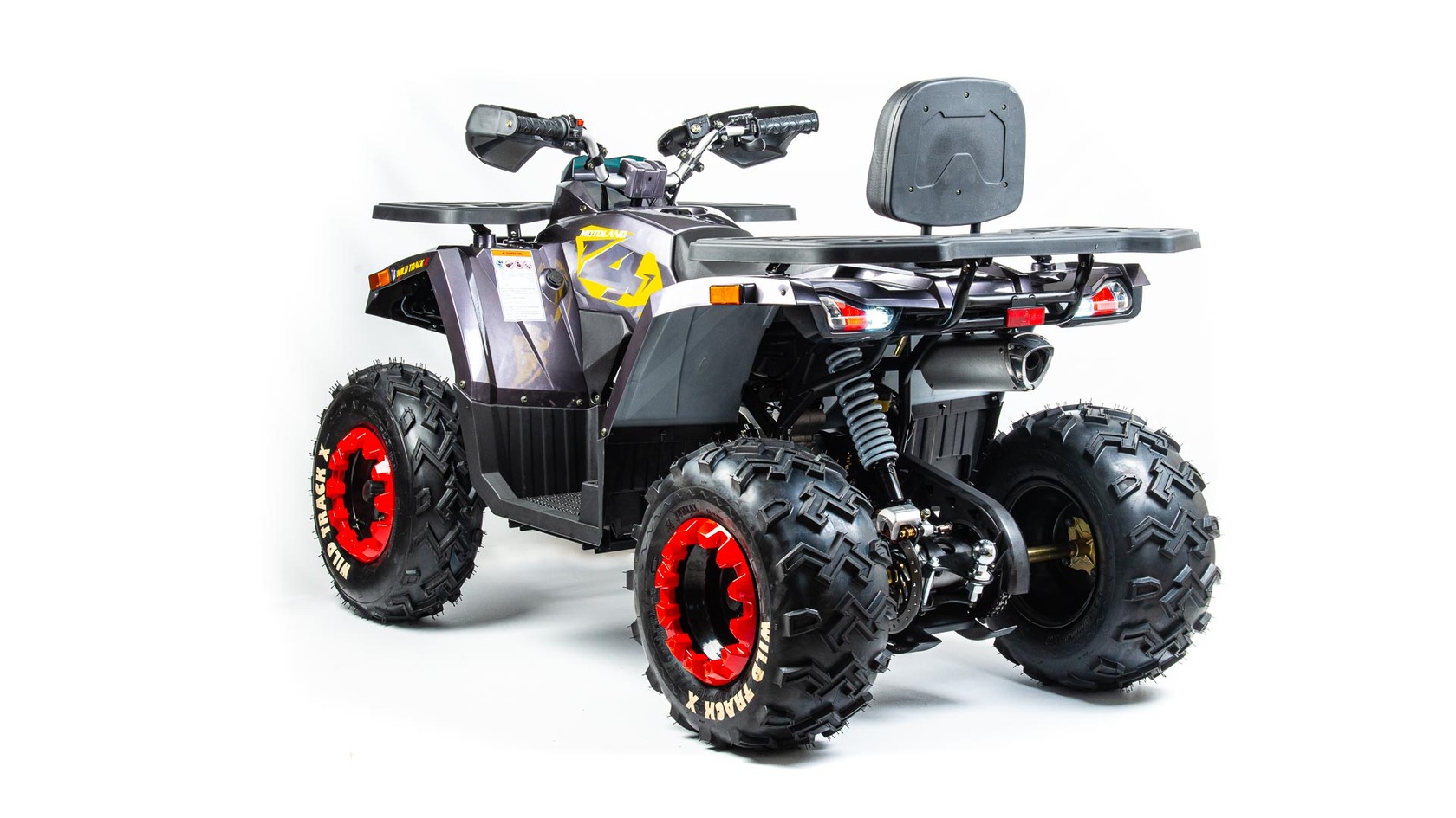 Motoland wild track X – сочетает в себе удобство ,простоту обслуживания и хорошую проходимость в самых разных условиях использования . Благодаря отлично настроенной подвеске управление и передвижение на нем становится очень комфортным. Все неровности и кочки, будут проглатываться без проблем, ведь на нем установлены колеса на 10 дюймов .Квадроцикл оснащен 161 QMK на 200 см3 двигателем c воздушно-масляным охлаждением и автоматической коробкой передач с реверсом , дисковыми тормозами, панелью приборов , линзованной оптикой с диодными ДХО , ручным стартером . Он отлично подойдет для семейных покатушек ,а также для рыбалки и охоты .Вы получите незабываемые впечатления от вождения .Данная комплектация поставляется почти собранная.