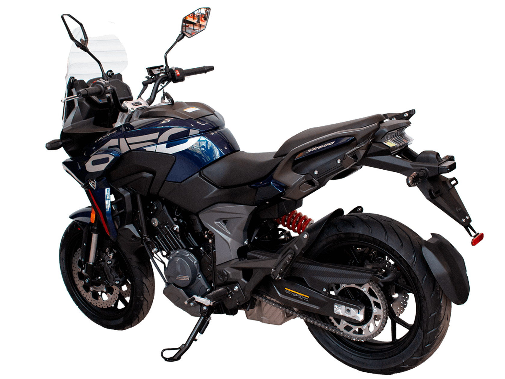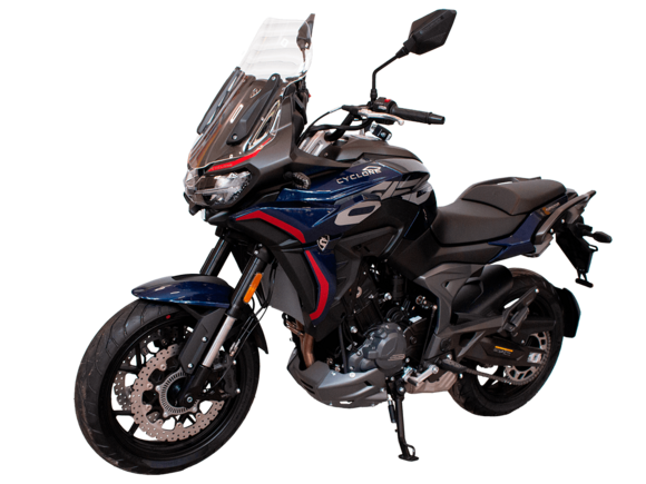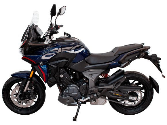 CYCLONE RX6 (SR650) – туристический эндуро для покорения самых непростых и протяжённых маршрутов. Он обладает агрессивным и современным дизайном, который выгодно выделяет его из всех остальных мотоциклов в своём классе. Мотоцикл дарит своему владельцу абсолютную свободу передвижения, позволяя долго и быстро ехать по шоссе, а при желании съезжать на такие дороги, по которым не проедет ни один дорожный мотоцикл. Небольшие габариты этого байка позволяют с успехом использовать его, как повседневный дорожный мотоцикл.Данная модель является самой крупнокубатурной в модельном ряде компании CYCLONE. Рядный двухцилиндровый четырёхтактный двигатель объёмом 650 см3 выдаёт мощность в 71 л.с. на 8500 об/мин. Максимальный крутящий момент достигается на 7000 об/мин и составляет 62 Н·м. Инжекторный впрыск топлива с блоком управления BOSCH увеличивает топливную экономичность, а также позволяет добиться высокой приёмистости и неприхотливости агрегата. Жидкостная система охлаждения не допустит перегрева двигателя даже при самом агрессивном вождении. На мотоцикл установлена 6-ступенчатая механическая коробка передач.Максимальная скорость мотоцикла составляет 180 км/ч.Модель оснащена литыми алюминиевыми дисками диаметром 17 дюймов. Колёса обуты в бескамерные покрышки от легендарной фирмы PIRELLI. С неровностями дороги эффективно справляются компоненты производства культовой японской компании KYB – телескопическая вилка перевёрнутого типа спереди и маятник с моноамортизатором сзади. Ход передней подвески составляет 130 мм, задней – 51 мм. Оба компонента подвески являются регулируемыми. Эффективное и безопасное замедление с любых скоростей обеспечивают гидравлические дисковые тормоза с двухканальной системой ABS спереди и сзади. Тормозные системы произведены известной испанской фирмой J.JUAN (входящей в легендарный холдинг BREMBO).Мотоцикл отличает хорошо продуманная компоновка с высоко расположенным радиатором. Высота 820 мм по седлу позволяет чувствовать себя комфортно даже райдерам небольшого роста. На данной модели установлена металлическая защита выхлопной системы и масляного фильтра. Под пассажирским сиденьем размещён небольшой, но крайне полезный набор инструментов.RX6 (SR650) оснащён бортовым компьютером с информативным цветным дисплеем и кнопками управления на руле, а также двумя штатными видеорегистраторами спереди и сзади. Из других приятных мелочей в допоборудовании мотоцикла стоит выделить регулируемое при помощи кнопки ветровое стекло, датчики давления в шинах, подсветку пультов, бесключевой доступ и 2 USB-порта.Клиренс мотоцикла составляет 165 мм. Объём топливного бака – 20 л. Снаряжённая масса – 245 кг.Мотоцикл сочетает в себе отличные технические характеристики, богатое оснащение, комфорт и надёжность, что позволяет вам ощутить настоящую свободу, отправившись на нём в любое путешествие.