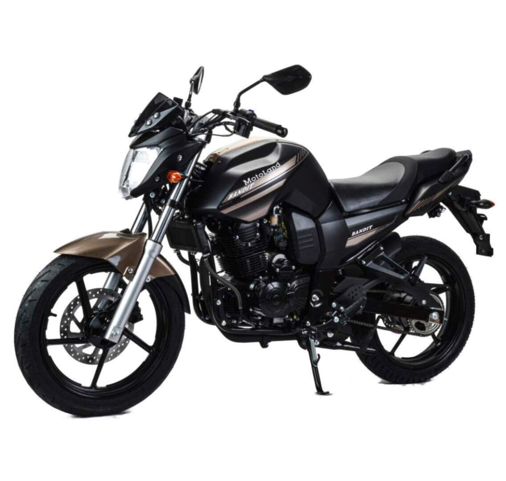 Мотоцикл Motoland BANDIT 300 является классическим представителем семейства дорожным мотоциклов. При этом он обладает всеми чертами мощного сити-байка необходимыми для комфортного передвижения как по городу, так и по шоссе.Стальная рама, объем топливного бака 18 литров. Расход топлива 3 л. на 100кмПодвеска передняя: Телескопическая. Подвеска задняя: моноамортизатор.Колесные диски алюминиевые, размер колес — 17 дюймов. Размер резины (перед / зад): 100/80/17 140/60/17Зеркала, крепление под номер, подножки второго пассажира. Тормоза дисковые. Мягкое сиденье, обшивка из кож-замаФара, электростартер, замок зажигания, АКБ, поворотники, стоп-сигнал, электронная приборная панель.Двигатель 175FMM бензиновый с воздушно-масляным охлаждением, его рабочий объем - 300 кубов, мощность 25 л.с. Коробка передач - механическая, 5-ступенчатая, знакомая всем водителям по автошколе, а потому разобраться не составит труда.