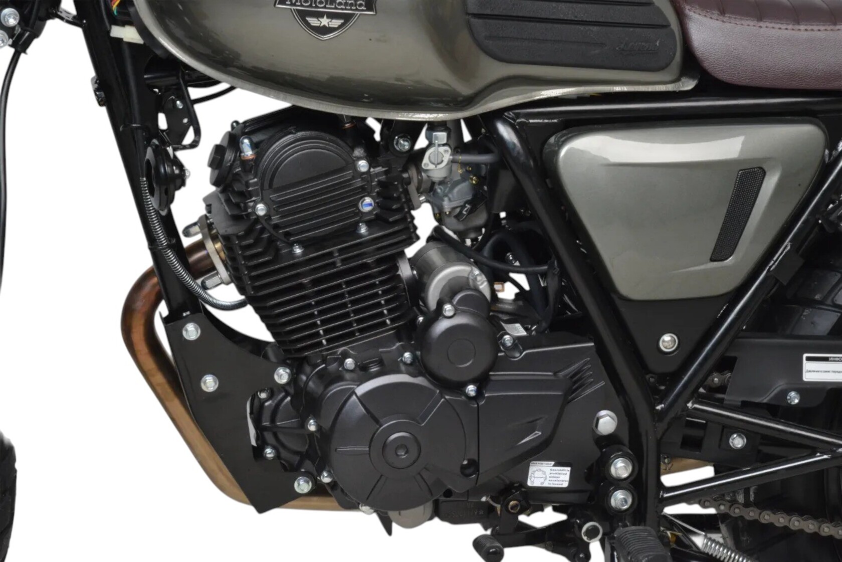 TEXAS 300 PRO. Дизайн мотоцикла выполнен в ретро стиле, укомплектованный обновленная LED-фарой, приборной панелью, USB-зарядкой, креплением номерного знака, резиновыми накладками на бак, обновленным глушителем из нержавеющей стали и прочими канонами современности. Классическая посадка, мягкое кожаное сиденье и литые колеса – всё это способствует комфортному управлению по асфальтированным дорогам и пересеченной местности.Мотоцикл оснащен двигателем 175FMN (баланс. вал), с 6 ступенчатой КПП, мощностью 25 л.с. Установлен усиленный толстостенный руль.Ходовая часть состоит из телескопической длинноходной вилки и задними амортизаторами с расширительными бачками.Топливный бак в 11 литров и экономичный мотор с расходом в 2,5 л./100км. Позволяют проезжать более 400 километров без дозаправки.Вес мотоцикла / вес в коробке 133 кг / 158 кг