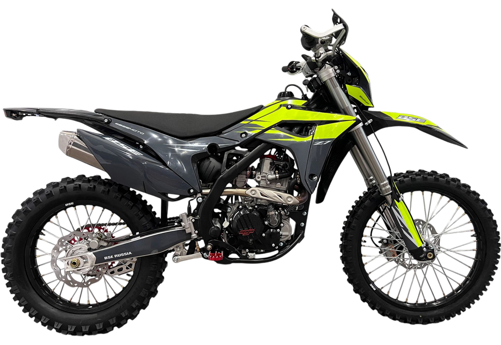 BSE Z7 – полноразмерный мощный эндуро мотоцикл с богатыми низами. Хотите прочный, мощный мотоцикл с жидкостным охлаждением на крепкой стальной раме? Планируете покорять новые внедорожные высоты и хотите начать принимать участие в эндуро гонках на серьезном уровне? BSE Z7 – идеальный выбор для покорения мира эндуро! Идеально сбалансированный, устойчивый, мощный эндуро мотоцикл на прочнейшей усиленной стальной раме. Сердце Z7 – мощный, эластичный и надежный 300 кубовый Zongshen ZS с водяным охлаждением. Отличный показатели крутящего момента на “низах” и “середине”. Система подачи топлива – спортивный карбюратор NIBBI RACING PWK 34. Z7 в заводской комплектации готов к покорению серьезного бездорожья благодаря полностью регулируемой подвески MOJO Racing c большими ходами, литым рычагам задней прогрессии, прямоточному выхлопу и “злой” внедорожной резине. Z7 идеально сбалансирован для эндуро, угол наклона вилки рассчитан специально для лёгкого преодоления высоких преград, подъёмов и барьеров. На мотоцикле установлены: прочнейший алюминиевый подрамник, усиленные легкосплавные колёсные диски, усиленная цепь, защита рук, датчик моточасов, прочные анодированные CNC ступицы, защита помпы и коллектора. Мощная гидравлическая тормозная система HSК Racing остановит байк в любых условиях. На BSE Z7 также можно с комфортном отправиться в продолжительное путешествие благодаря удобному сиденью, широкому спортивному рулю и наличию электростартера. Благодаря яркой LED фара головного света можно кататься в ночное время.