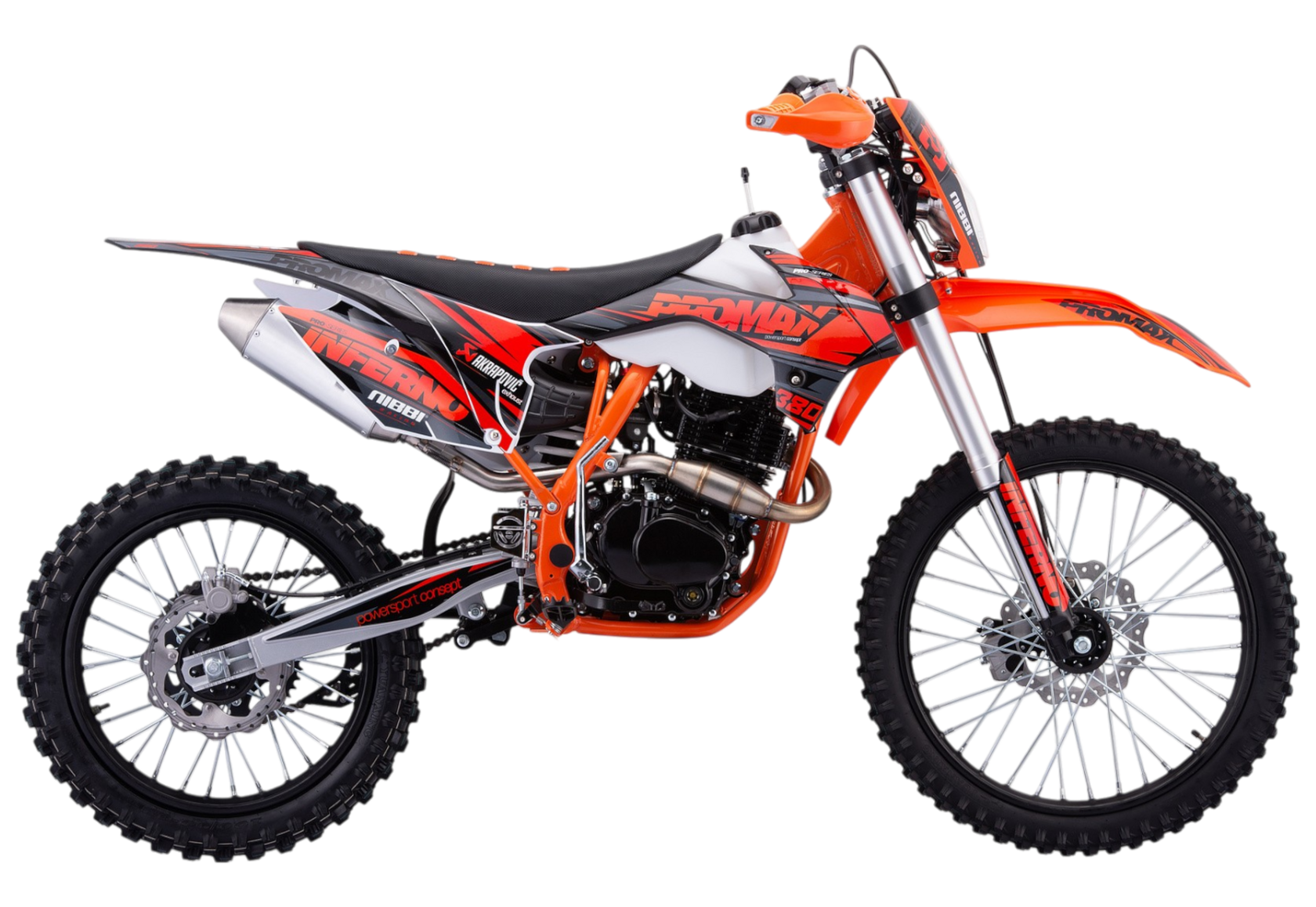 Главная ... Мотоциклы внедорожные Кроссовый мотоцикл PROMAX INFERNO 380 (4 valves, 5 gears) оранжево-черный