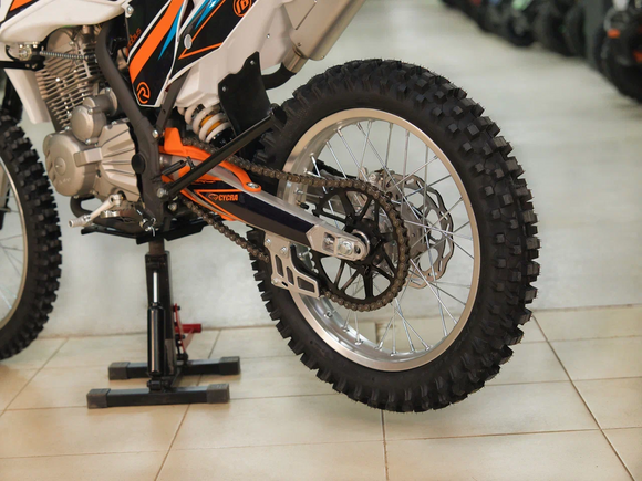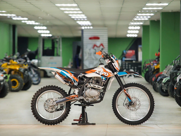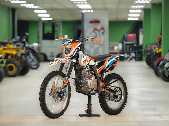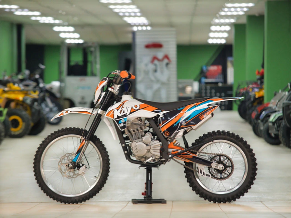 Мотоцикл KAYO K1 250 MX – “народная” версия внедорожного мотоцикла от компании KAYO. Идеальный снаряд для внедорожного экстрима, представляющий собой оптимальный баланс производительности и технической оснащённости, поэтому он идеально подходит как новичкам, так и опытным райдерам. Удобный, простой и надёжный мотоцикл, который полностью оправдывает свою цену.Мотоцикл оснащён одноцилиндровым 4-тактным двигателем воздушного охлаждения (ZONGSHEN ZS172FMM) объёмом 249 см3, который обеспечивает высокую мощность (21 л.с.) и крутящий момент, что позволяет развивать большую скорость и с лёгкостью преодолевать трассы со сложным рельефом. Карбюраторная система подачи топлива с карбюратором NIBBI PE30 обеспечивает бесперебойную работу техники в самых жёстких условиях эксплуатации, простоту и лёгкость в обслуживании, а также неприхотливость к качеству топлива. Аппарат оснащён 5-ступенчатой механической коробкой передач с классической схемой “1-N-2-3-4-5”.Усиленная рама из хром-молибденового сплава и подвеска позволяют эффективно амортизировать удары при езде по неровностям и препятствиям на трассе. Передняя подвеска телескопическая вилка перевёрнутого типа от фирмы KKE длиной 800 мм, задняя — нерегулируемый моноамортизатор 360 мм, рассчитанный на высокие нагрузки до 900 LBS, также произведённый компанией KKE. Мотоцикл оснащён классическими спицованными колёсами диаметром 18 и 21 дюйм. Колёса имеют усиленные обода из алюминиевого сплава и буксаторы. Эффективное и безопасное замедление с любых скоростей обеспечивают гидравлические дисковые тормоза.Мотоцикл достаточно компактен и имеет вес всего в 105 кг, поэтому он комфортен в эксплуатации одновременно и для мужчин среднего телосложения, и для девушек. Аппарат оснащён системой запуска двигателя при помощи кнопки электростартера или при помощи рычага кик-стартера.Высококачественная износостойкая резина с развитым протектором отлично держит дорогу на различных типах покрытия и в самых разных поворотах. Сиденье эргономичной формы покрыто антискользящим материалом.K1 250 MX сочетает в себе отличные технические характеристики, комфорт и надёжность, что позволяет вам ощутить настоящую свободу на любой трассе.