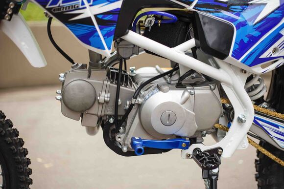 О надёжный питбайк APEX125 идеален для поездок по грунтовым дорогам и бездорожью. Хорошо чувствует себя на мягком и среднем грунте, разгоняется до 90 км/ч. Оснащён CNC траверсами, фарой, алюминиевыми ободами, весит всего 90 кг. Питбайк прост в управлении и не требует специального ухода, подойдёт как новичкам, так и любителям мотокросса.У кроссового мотоцикла APEX125 отличный узнаваемый дизайн. Конструкция подчёркивает неуступчивый спортивный характер питбайка, который не остановится ни перед одним препятствием. Пластик комбинированный, прочный, не ломается при сгибании. Кроссовый мотоцикл APEX125 доступен в красном и синем цвете, при этом в основной цвет окрашен не только пластик, но и обода колёс и другие детали питбайка.Передняя подвеска — телескопическая нерегулируемая вилка перевёрнутого типа, которая отлично подходит для преодоления ям, ухабов и других неровностей плохих дорог или их отсутствия. Задняя подвеска маятниковая с моноамортизатором. Руль 22 мм с высоким подъёмом и перекладиной удобен для мотоциклистов разного роста. Ручки руля — комфортные PRO TAPER. Питбайк оснащён складными рычагами сцепления и переднего тормоза, а также CNC-лапкой переключения передач.Питбайк весит всего 75 кг, при этом выдерживает вес до 150 кг. Оснащён CNC траверсами, рама полудуплексная стальная, мотоцепь качественная. Колёса спицованные, сделаны из прочного и лёгкого алюминия. Размер заднего колеса — 14 дюймов (350 мм), переднего — 17 дюйм (430 мм). Тормоза дисковые, передний тормозной суппорт двухпоршневой, задний — однопоршневой.Питбайк оснащён карбюратором с фильтром нулевого сопротивления VM22 MIKUNI и одноцилиндровым четырёхтактным двигателем с воздушным охлаждением. Надёжный мотор мощностью 9 л. с. и объемом 125 см³ разгоняет кроссовый мотоцикл APEX125 до 90 км/ч. Коробка передач механическая, четырёхступенчатая. Система зажигания электронная (CDI), для запуска двигателя можно использовать кикстартер и электростартер.СверхпроходимостьПокрышки с шипами и высоким грунтозацепом идеальны для бездорожья. Мощность мотора и небольшой вес питбайка позволяют ему преодолевать значительные препятствия и непролазную грязь, хорошо заходить в подъёмы.Для поездок при низкой видимости и в ночное время суток питбайк оснащён фарой, которая включается при повороте замка зажигания (1 – выключить, 2 – включить, 3 – свет). Также в комплекте есть щиток для номера, который ставится вместо фары.Питбайк 125 относится к недорогим моделям, которые при должной эксплуатации работают без сбоев и капризов. Кросс неприхотлив в обслуживании, не занимает много места в гараже. При необходимости в нём легко сменить любую повреждённую деталь. Купить питбайк 125 вы можете в официальном магазине Мотолэнд, здесь же всегда можно приобрести запасные детали и комплектующие, которые стоят недорого и всегда есть в продаже. При покупке питбайка не забудьте о защитной экипировке.