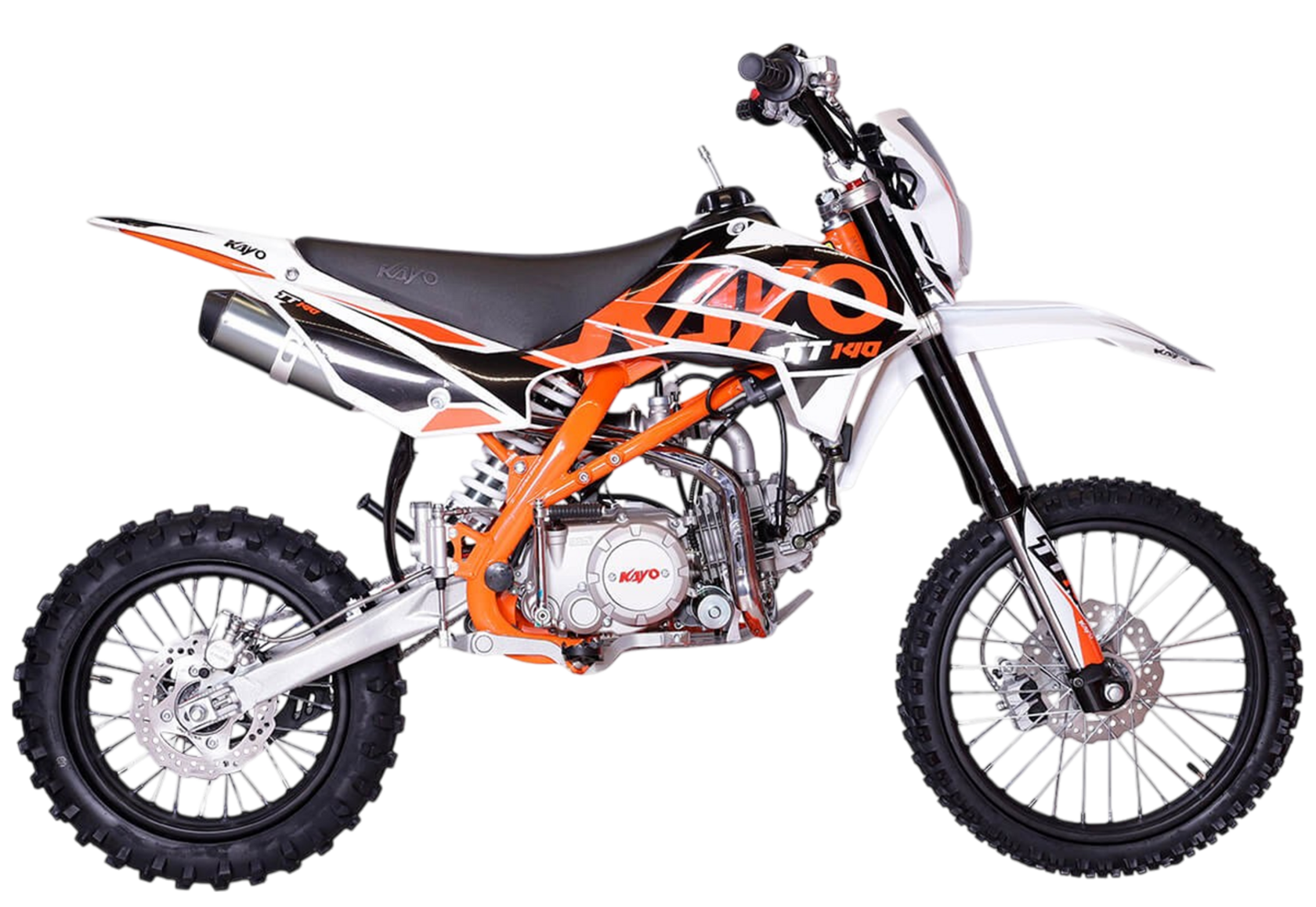 Питбайк KAYO Basic TT140 KRZ – версия для прогрессирующих и хороший старт для тех, кто готов перейти от базовых тренировок к более сложным заездам. Подходит для лёгкого эндуро и оттачивания мастерства.Одноцилиндровый 4-тактный двигатель воздушно-масляного охлаждения YX1P56FMJ объёмом 140 см3, выдаёт 13 л.с. Карбюратор NIBBI PE19 обеспечивает бесперебойную работу техники в самых жёстких условиях эксплуатации, простоту и лёгкость в обслуживании, а также неприхотливость к качеству топлива. Питбайк имеет вместительный топливный бак на 5,5 л. Питбайк оснащён механической 4-ступенчатой коробкой передач с формулой “N-1-2-3-4”. Запуск двигателя осуществляется с помощью рычага кикстартера.Мотоцикл имеет вес всего 73 кг. Усиленная рама из хром-молибденового сплава и подвеска позволяют эффективно амортизировать удары при езде по неровностям и препятствиям на трассе. Передняя подвеска — телескопическая вилка перевёрнутого типа длиной 770 мм, задняя — моноамортизатор длиной 360 мм. Оба компонента подвески являются нерегулируемыми. Рама и пластик являются собственной разработкой производителя. Мотоцикл оснащён классическими стальными спицованными колёсами диаметром 17 дюймов спереди и 14 дюймов сзади. Эффективное и безопасное замедление с любых скоростей обеспечивают гидравлические дисковые тормоза. Высококачественная износостойкая резина с развитым протектором отлично держит дорогу на различных типах покрытия.Питбайк оснащён яркой светодиодной линзованной фарой, позволяющей кататься в тёмное время суток.Если вы ищете послушный, компактный, динамичный и красивый питбайк, считайте, что вы его нашли. Это один из лучших мотоциклов для обучения и первых шагов в эндуро и мотокроссе. Он отлично подойдёт как для гонок на трассе, так и для обычного катания по пересечённой местности.