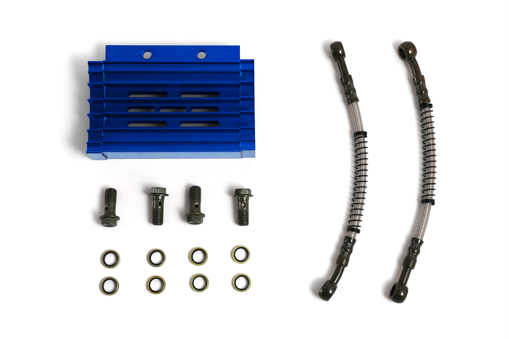 Высококачественный комплект радиатора масляного охлаждения с корпусом из прочного CNC-обработанного алюминия, с ярким синим анодированным покрытием. Предназначен для установки на 90% питбайков и мопедов с объёмом двигателя от 125 до 190 см³. Эффективно охлаждает масло, предотвращая перегрев двигателя и увеличивая его ресурс, особенно при активной эксплуатации.